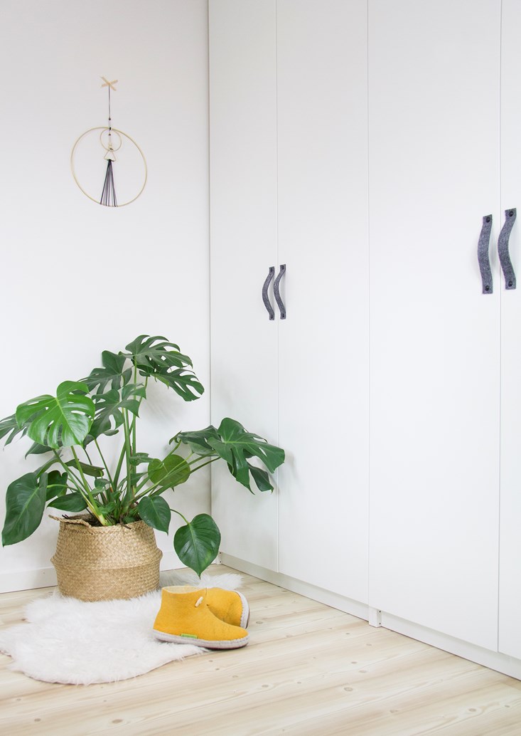 Namelijk: vilten handgrepen. Geen wereldshockende hack, maar wel net even anders dan de leren handgrepen. Het vilt wat ik gebruik is synthetisch vilt, sterk, dik en ook vegan. Net zo leuk als een leren handgreep, maar veel warmer qua uitstraling. Het meubelstuk waaraan ik de handgrepen ga bevestigen is onze nieuwe garderobekast. In ons vorige huis zaten de kasten ingebouwd, super praktisch, maar zodoende propten we onze kleren het afgelopen jaar in te kleine en onhandige ladenkastjes. Met onze nieuwe gigantische kast is ons volwassen leven een feit. Ik beeld me in dat er over een x-aantal jaar ook kinderbeddengoed, slaapzakken en trouwkleding in opgeborgen wordt en dat hij never nooit te klein wordt.