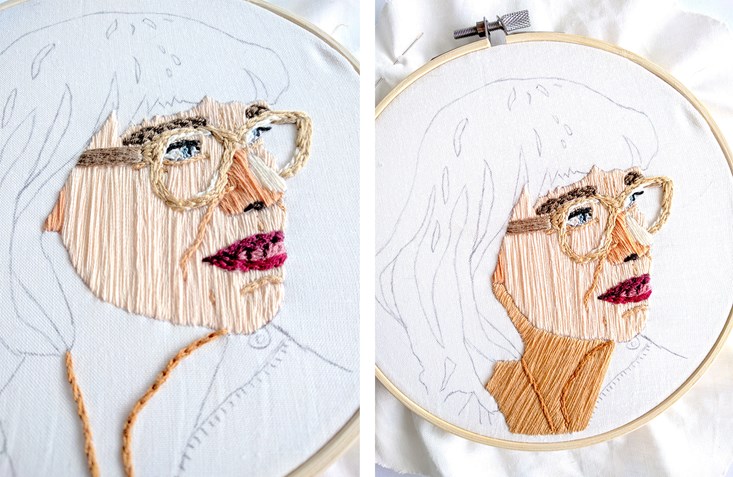 Als eerste teken ik het portret op stof, waarna ik het strak trek in een borduurring. Vervolgens begin ik met de kleine karaktertrekken, waaronder rimpeltjes, ogen en mond. Daarna vul ik het gezicht in en ga ik verder met de nek en het haar. Als allerlaatste borduur ik de achtergrond met de kleur die het mooiste bij de rest staat.